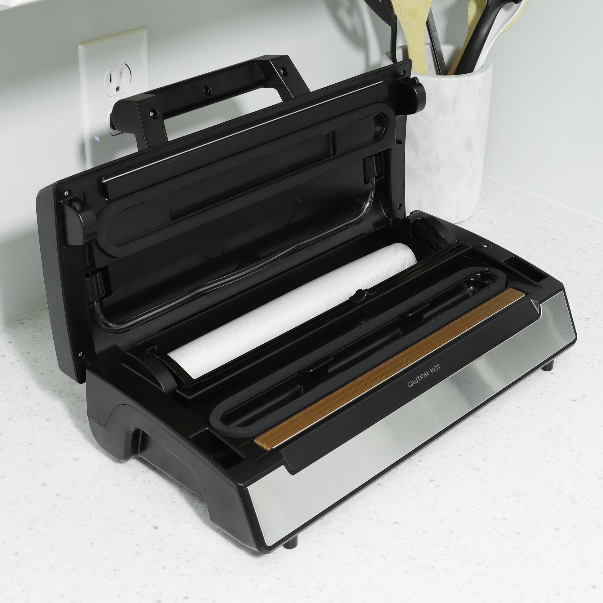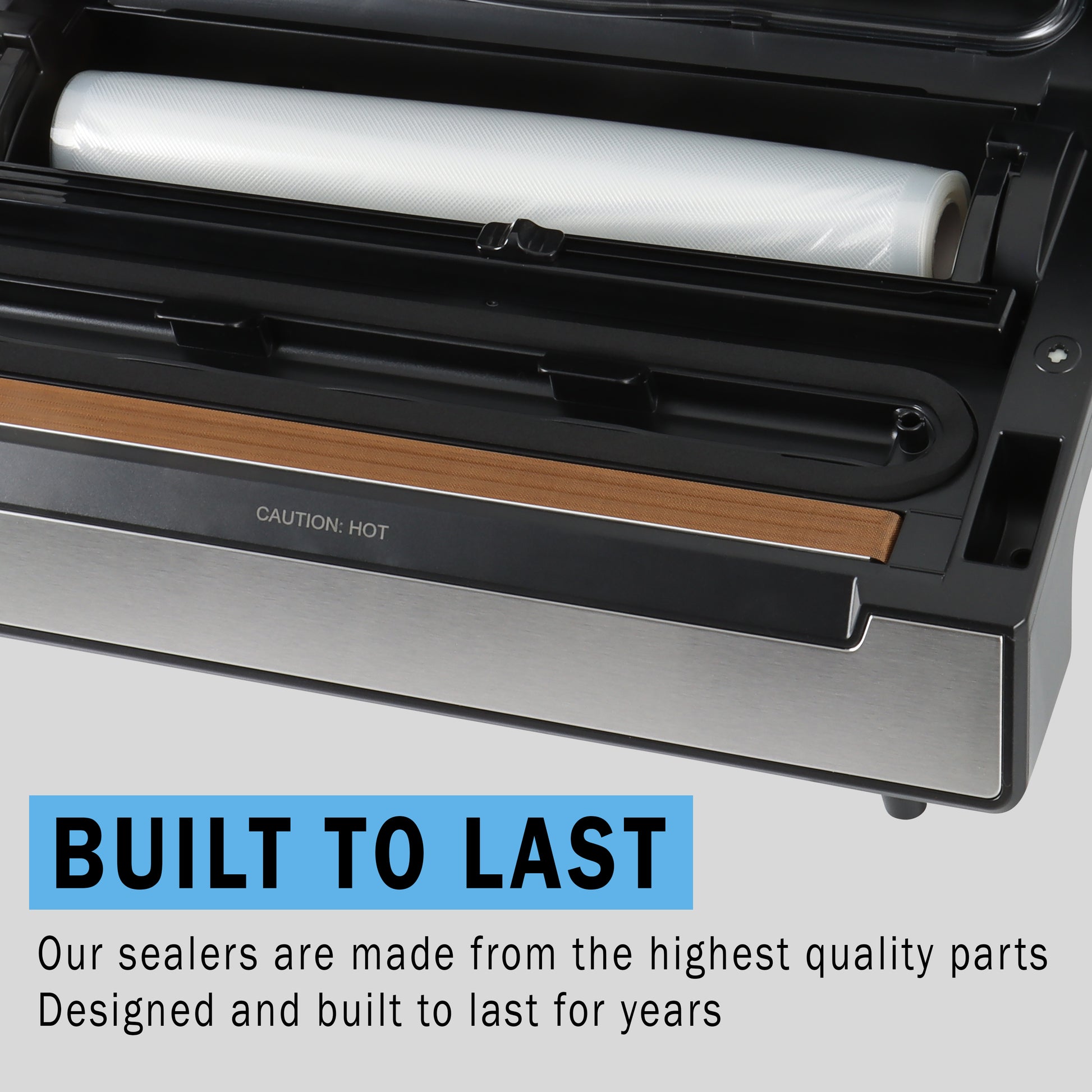 Built-In Storage, Roll Cutter & Bag Holder: Custom bag sizes? No problem. This sealer includes built-in roll storage and an integrated cutter system to streamline your sealing process and save precious counter space.